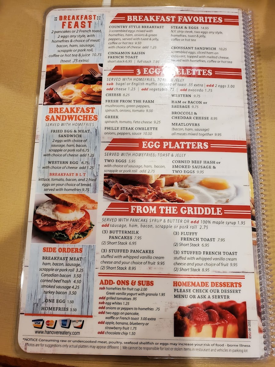 The menu at Hanover Eatery offers a straightforward and comforting selection that reflects the warmth of a classic American diner and family restaurant. Here, you’ll find a variety of hearty breakfast dishes, casual lunch options, and familiar favorites designed to feel like a satisfying, unhurried meal any time of day.